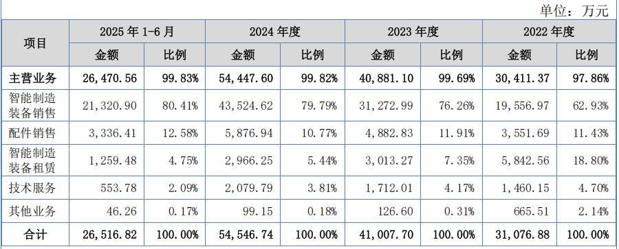 公司主营业务收入构成来源主要为智能制造装备销售,2023年,公司智能制造装备销售金额增长11,716.03万元,销售占比上升12.19个百分点,伴随公司新产品、新机型的不断推出,公司产品线更为丰富,叠加客户对自动化升级改造需求上升,带动公司智能制造装备销售金额有所增长;公司2022年5月非同一控制下合并苏州锐翊,故2022年度苏州锐翊收入非完整年度。2024年,公司智能制造装备销售金额增长12,251.62万元,销售占比上升3.44个百分点,主要受公司新开发的适用于模组客户的组装贴装类设备销售取得重大突破影响,带动公司智能制造装备销售额进一步提升。报告期,公司智能制造装备租赁业务整体呈收缩趋势。
