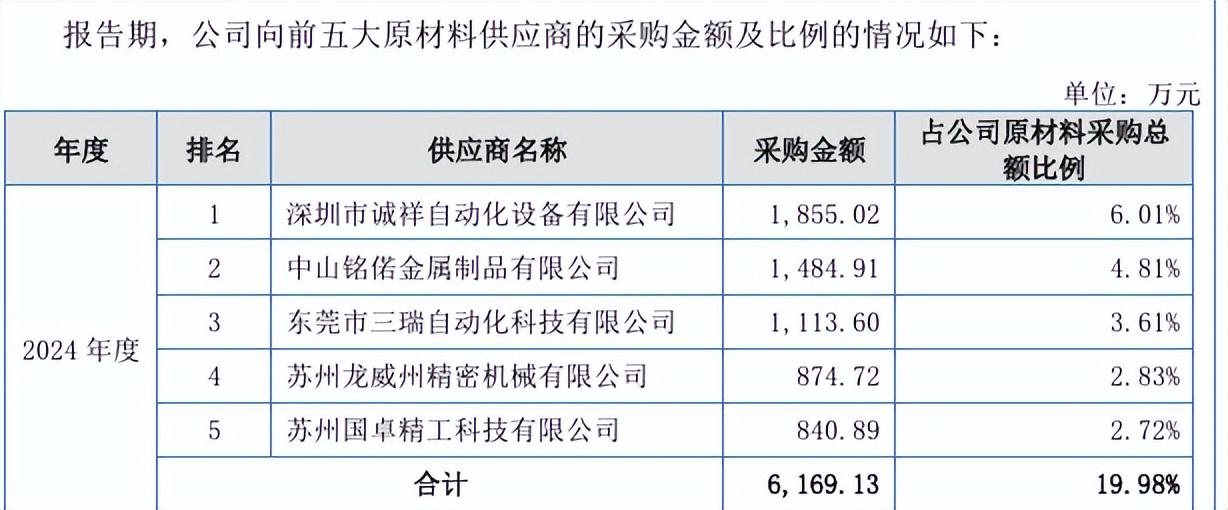 2023年,公司新增前五大供应商主要为深圳市诚祥自动化设备有限公司、苏州国卓精工科技有限公司。前者成立于2013年,参保人数仅在3人和13人间波动。2024年采购额即达1,855.02万元,占比6.01%,成为第一大供应商。后者成立于2021年11月,参保人数仅为0人到2人。