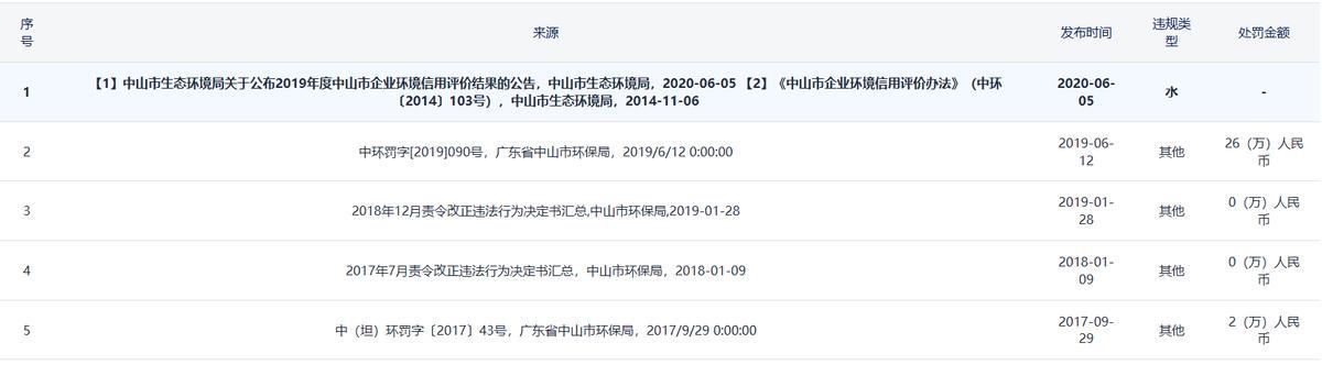中山铭偌金属制品有限公司为锐翔智能常年的前五大供应商之一,据公开环保资料显示,2017年至2020年连续受到环保处罚。2019年的中环罚字[2019]090号行政处罚,其违反建设项目“三同时”及验收制度,罚款26万元;责令停止生产或者使用。
