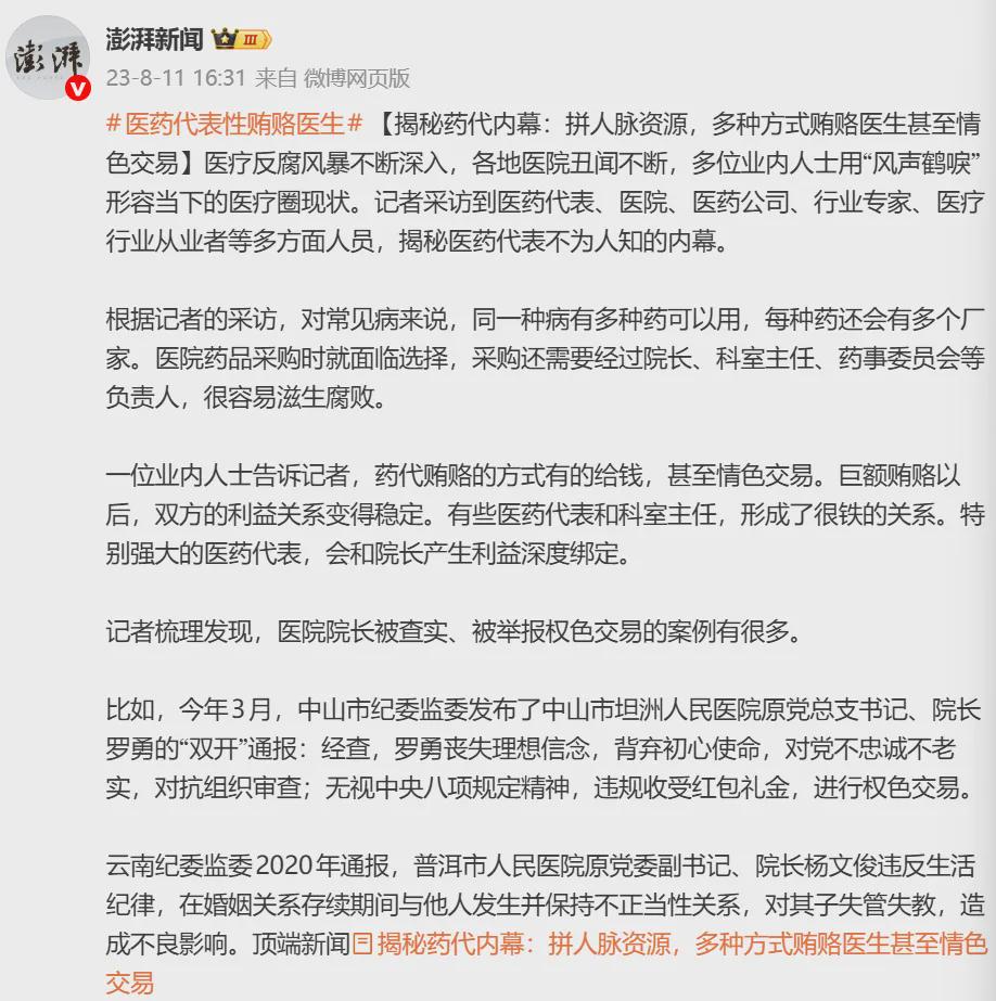 药代贿赂的方式有的给钱,甚至情色交易。巨额贿赂以后,双方的利益关系变得稳定。有些医药代表和科室主任,形成了很铁的关系。特别强大的医药代表,会和院长产生利益深度绑定。