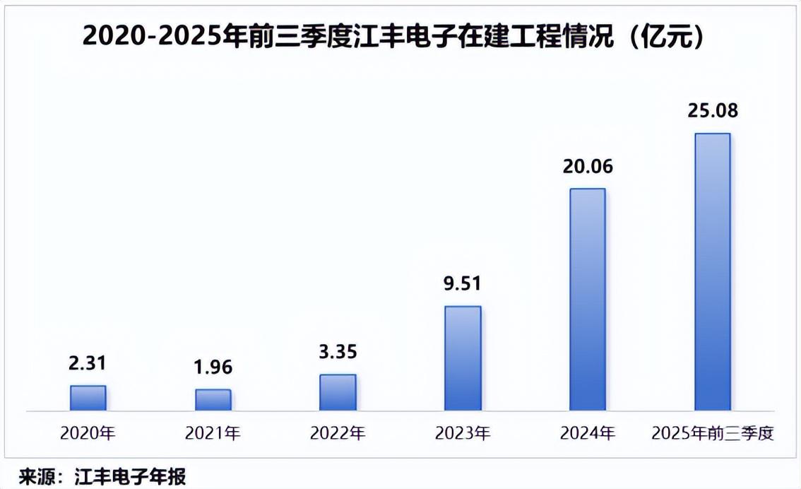 2020-2025年前三季度,江丰电子在建工程从2.31亿元飙升至25.08亿元。短短五年间,在建工程规模增长近11倍。