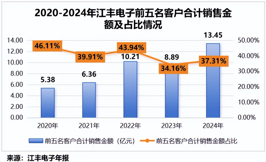 2020-2024年,公司前五名客户合计销售金额从5.38亿元增长至13.45亿元,前五名客户销售金额占比整体维持在34%至46%之间,不存在单一客户过度依赖的情况。