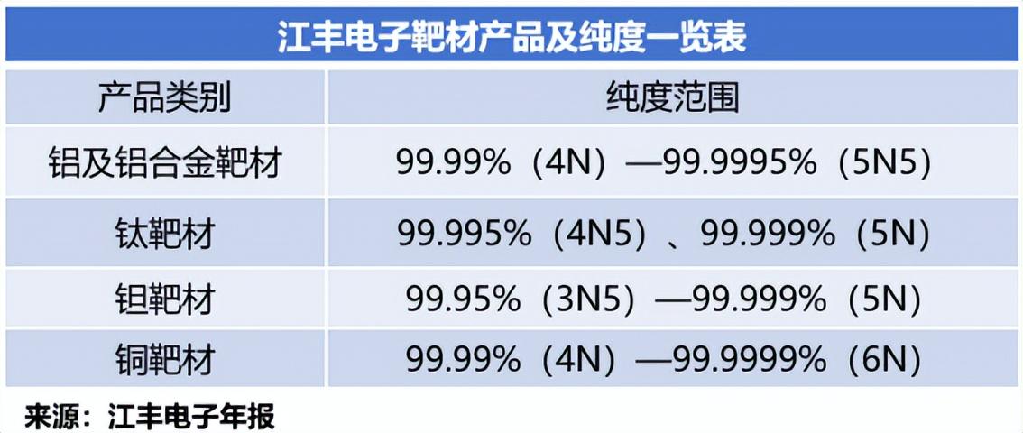 江丰电子主要生产超高纯金属溅射靶材,包括超高纯铝靶材、超高纯钛靶材及环件、超高纯钽靶材及环件、超高纯铜靶材及环件、钨钛靶、镍靶、钨靶等产品。