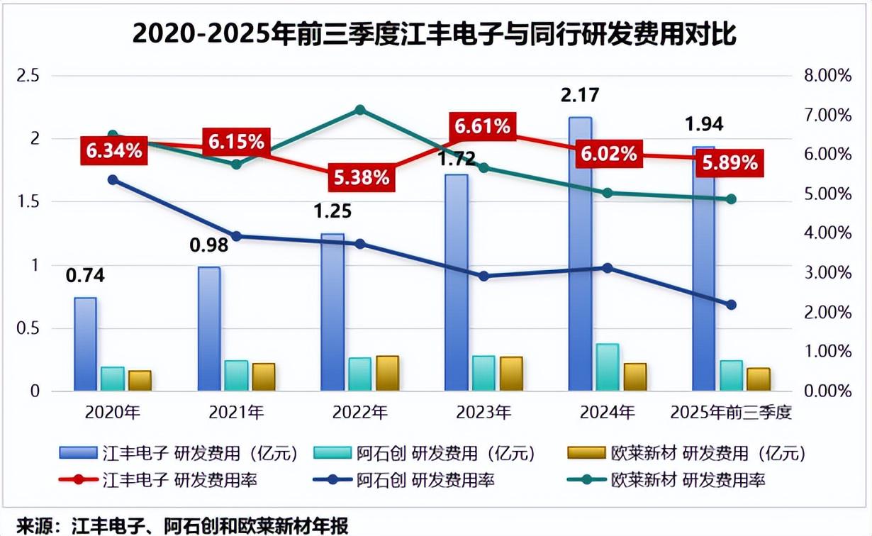 2020-2025年前三季度,江丰电子累计投入研发费用8.8亿元,研发费用率始终保持在5%以上水平,投入力度显著高于阿石创、欧莱新材等同行。