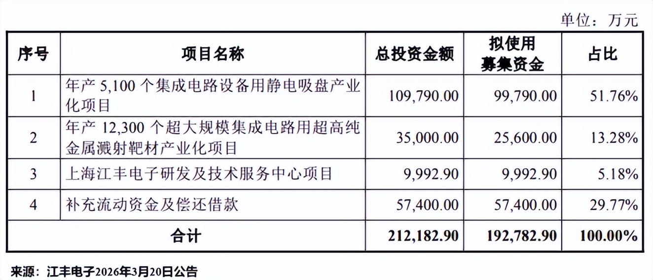 2026年3月20日,公司再次发布公告,将募资总额明确为19.28亿元,主要投向国内静电吸盘产业化项目(9.98亿元)和韩国靶材生产基地项目(2.56亿元)。
