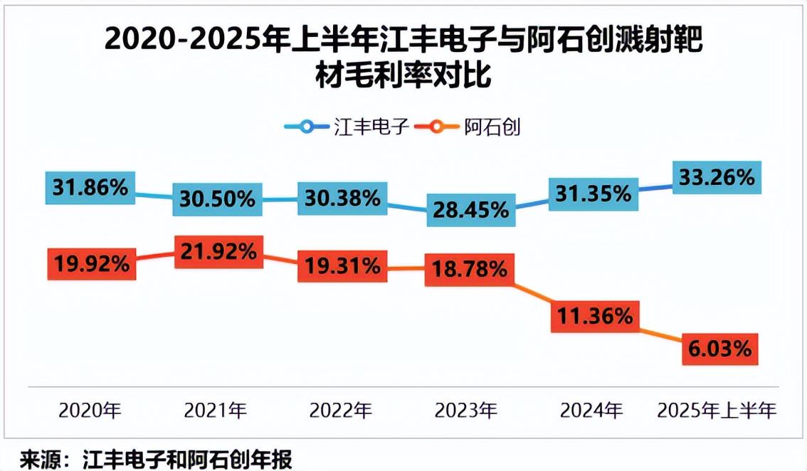 先看数据,2020-2025年上半年,江丰电子与同行企业阿石创的溅射靶材业务毛利率呈现出完全不同的走势: