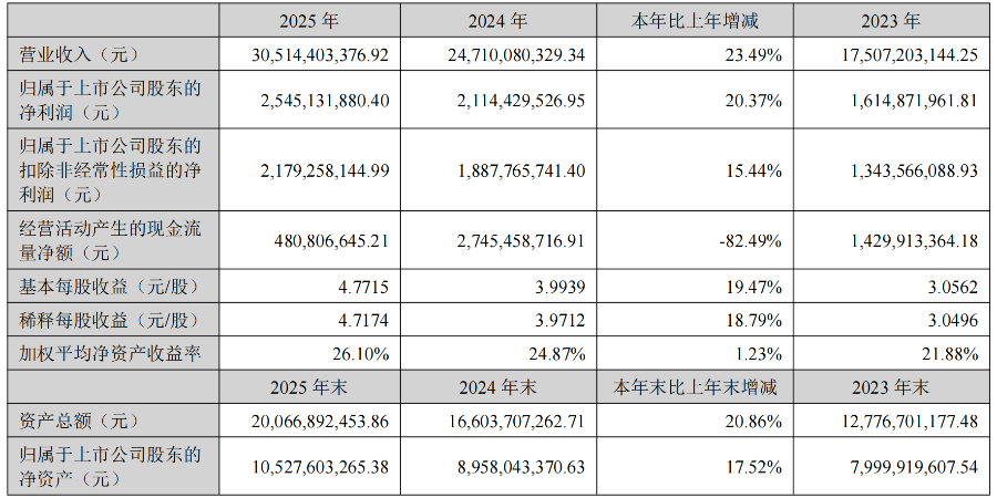 截至报告期末,公司实现总营业收入305.14亿元,同比增长23.49%;实现归母净利润25.45亿元,同比增长20.37%。