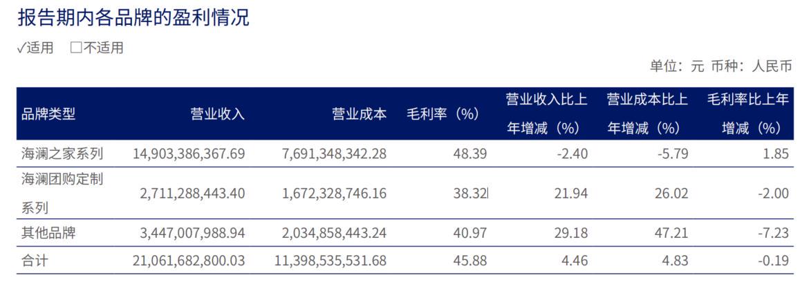 分品牌看,海澜之家旗下品牌布局多元,包括主品牌海澜之家、职场女性服饰品牌OVV、简潮时尚男装品牌黑鲸、高端婴童生活方式品牌英氏、竞技运动品牌HEAD、海澜团购定制业务,并与阿迪达斯、京东奥莱达成战略合作。主品牌海澜之家营收同比下降2.4%至149.03亿元;海澜团购定制营收增长21.94%至27.11亿元;(包括英氏YeeHoO、黑鲸、OVV等在内的)其他品牌业务营收增长29.18%至34.47亿元。