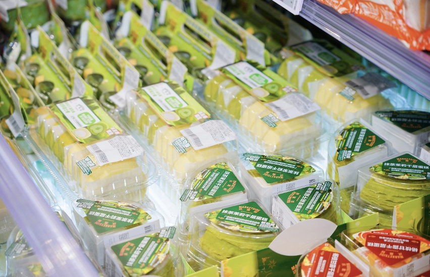 配合当下沃尔玛的“抹茶季”系列新品上市,社区店将这个系列的烘焙、零食、饮料、冰淇淋等数十款抹茶新品做了重点堆头的陈列和展示。除此之外,几乎每个品类,社区店的货架上都是“沃集鲜”商品在“唱主角”。从鲜奶、果汁、面包、蛋糕到轻食沙拉和预制菜肴,都是沃集鲜自有品牌商品。