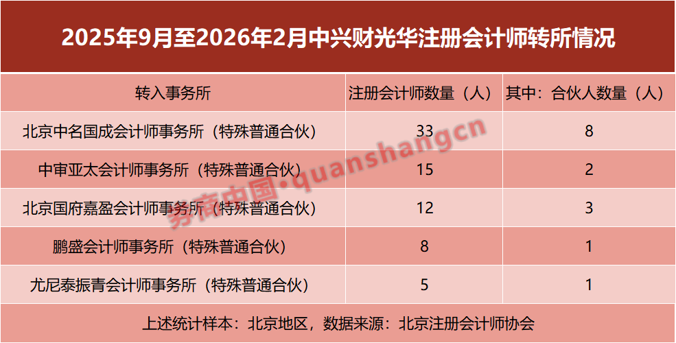 从流向来看,根据记者统计,在2025年9月—2026年2月期间,中兴财光华北京地区共有33名注册会计师加入北京中名国成会计师事务所(特殊普通合伙)(以下简称“中名国成所”),占比25%。其中多达8位是中兴财光华前合伙人。