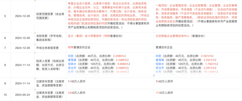 被罚后仅2个月(2024年12月26日),亚太(集团)所“摇身一变”更名为“北京郎鉴企业管理咨询中心(普通合伙)”。经营范围全面退出审计、会计业务,转做企业管理咨询。