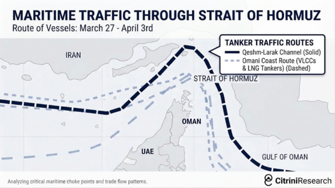 Citrini Research的调研显示,4月初,霍尔木兹的日均通行量已经回升至约15艘。更关键的不是数字,而是15艘船都经过了伊朗的审批。
