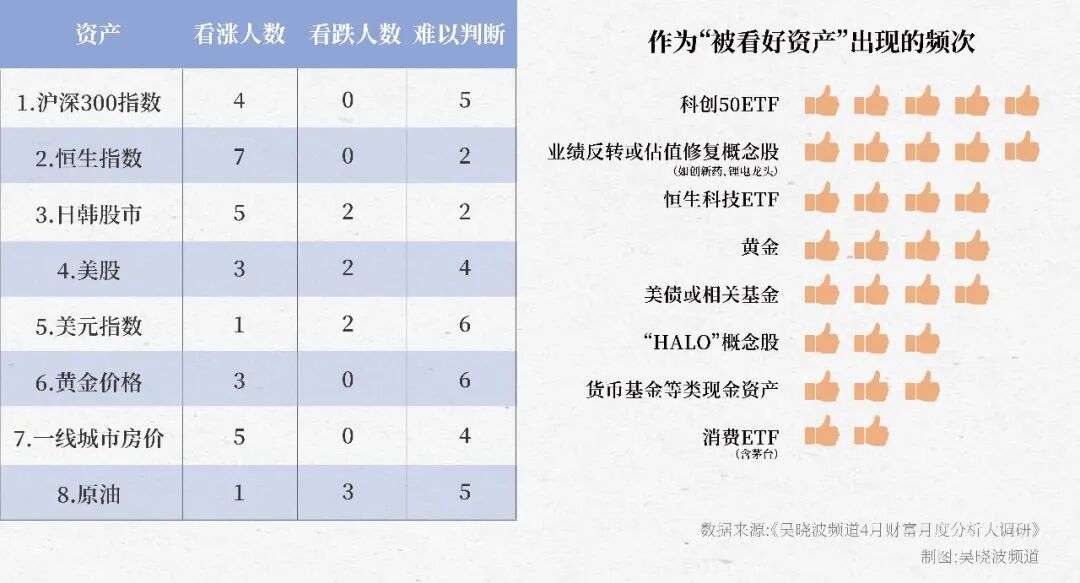 在报告中,我们也邀请9位专家们在对恒生指数、沪深300,日韩股市、美股、美元指数、黄金、一线城市房产、原油八大资产进行涨跌预测,同时,对科创50ETF、业绩反转或估值修复概念股、恒生科技ETF、消费ETF、黄金、美债、HALO概念股、货币基金八个投资标的进行配置建议。