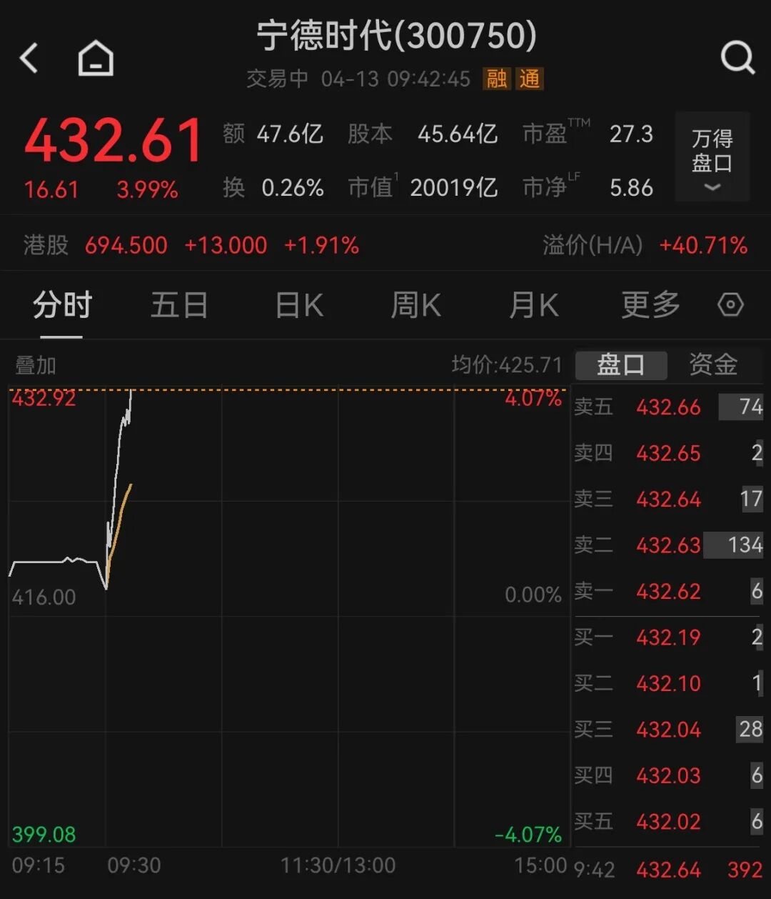 4月13日盘初,宁德时代A股拉升涨近4%,报432.61元/股,股价再创新高,成交额达47.6亿元;港股方面,宁德时代涨近2%,报694.5港元/股。