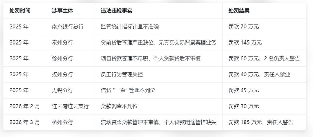 扬州分行因员工行为管理失控被罚 40 万元,相关责任人被禁业;无锡、徐州分行也相继因信贷 “三查” 不到位,分别被罚 45 万元、60 万元。进入 2026 年,合规风险非但未收敛,反而加速发酵。