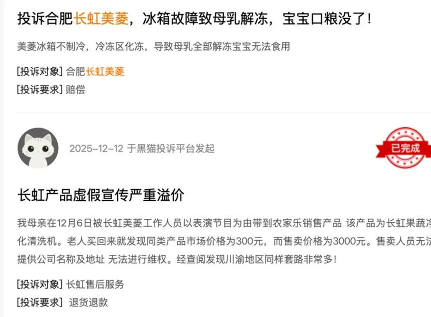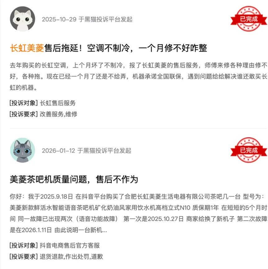 近年来,关于长虹美菱冰箱、油烟机等产品故障的投诉在各大消费者平台不断涌现,仅黑猫投诉平台上,涉及长虹美菱的投诉就有200多条,问题集中在“冰箱制冷效果差”“售后维修推诿”“油烟机异响”等方面。