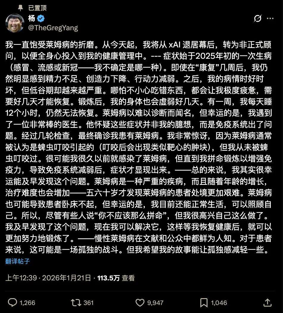 由于长期处于超负荷运转状态,Greg Yang 的身体亮起了红灯,被诊断出患有莱姆病。