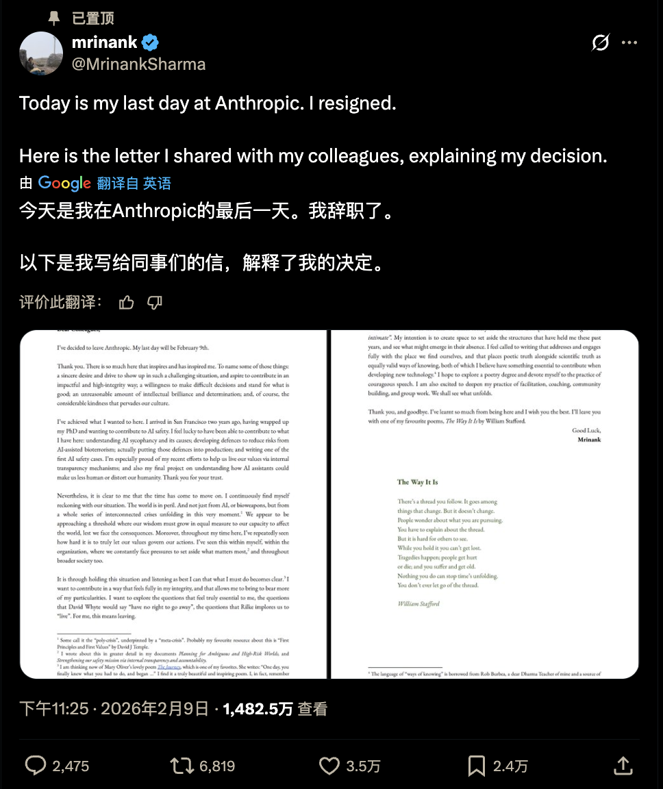 在 Anthropic,曾经领导安全团队的 Mrinank Sharma 放弃了在这条黄金赛道上的大好前程。