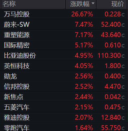 汽车与零配件板块走高,万马控股涨超26%,蔚来涨超7%,比亚迪股份涨近5%。
