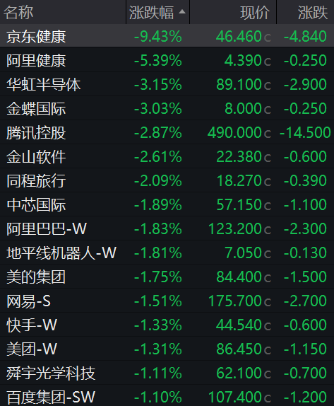 科网股普跌,京东健康跌超9%,阿里健康跌超5%,腾讯控股、金山软件跌超2%,阿里巴巴、美的集团、百度集团等跌超1%。