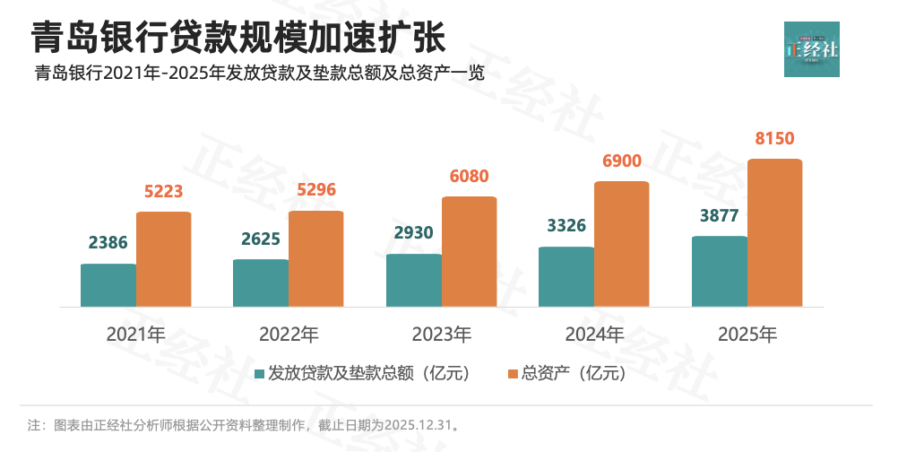 根据年报提供的数据,2021年至2025年,青岛银行发放贷款及垫款总额分别为2386.09亿元、2625.19亿元、2929.93亿元、3325.54亿元、3876.93亿元,同比增速分别达17.91%、10.02%、11.61%、13.50%、16.58%。常年保持两位数增长,而且2023年以后成加速度增长。