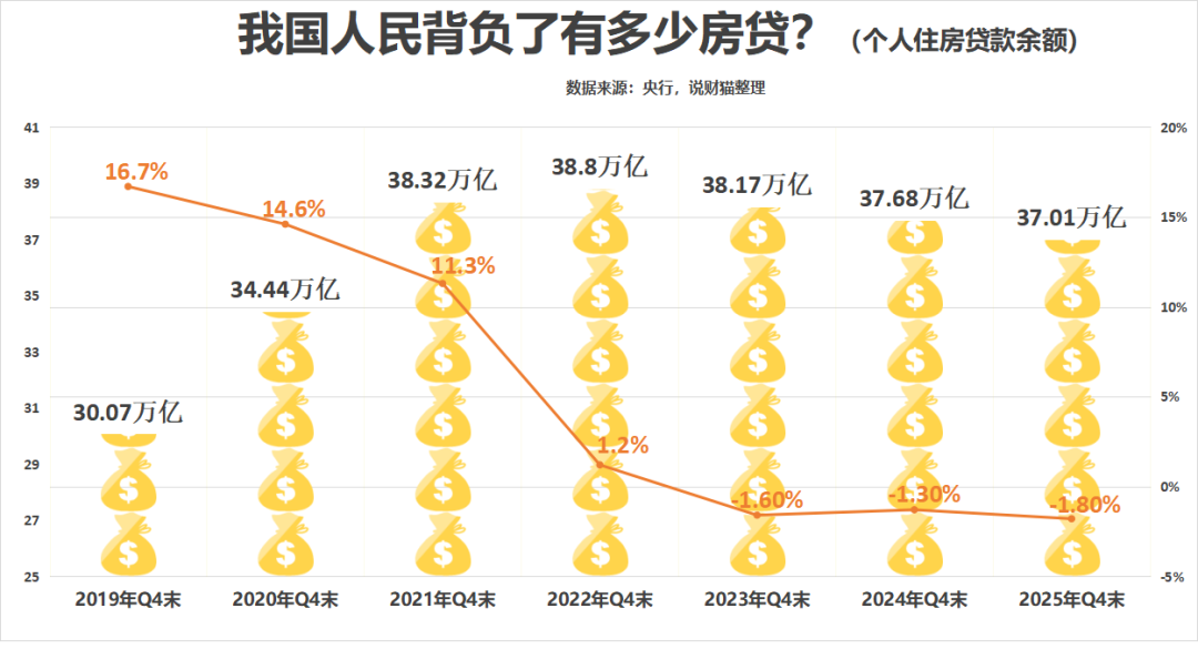 截至去年末, 个人住房贷款余额 是37.01万亿,较高位净减少还不到2万亿。