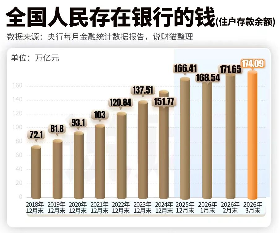 达到174.09万亿,人均存款12.44万。