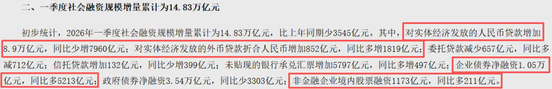 一季度,社融增量14.83万亿,对实体经济发放的人民币贷款增加8.9万亿,同比少增7960亿;