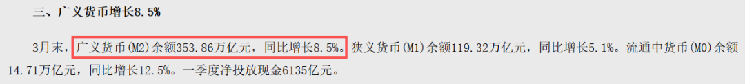 首先看放水速度,主要是指广义货币M2的增速,一季度末是8.5%。