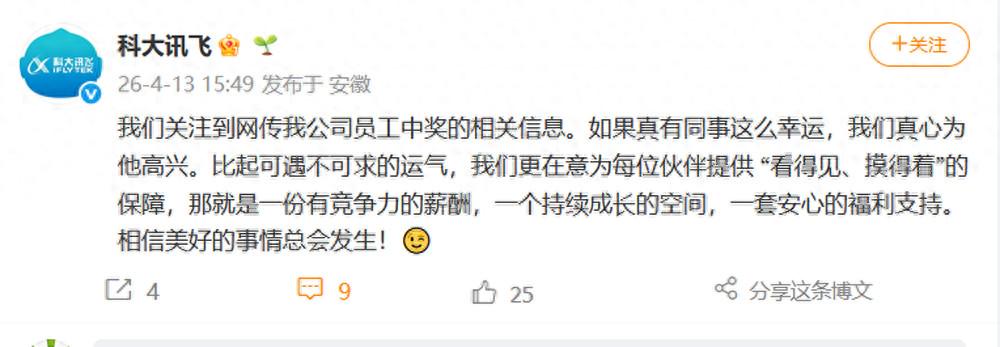 就“员工买彩票中1500万元当场辞职”的网络热议话题,科大讯飞4月13日下午通过官方微博回应: