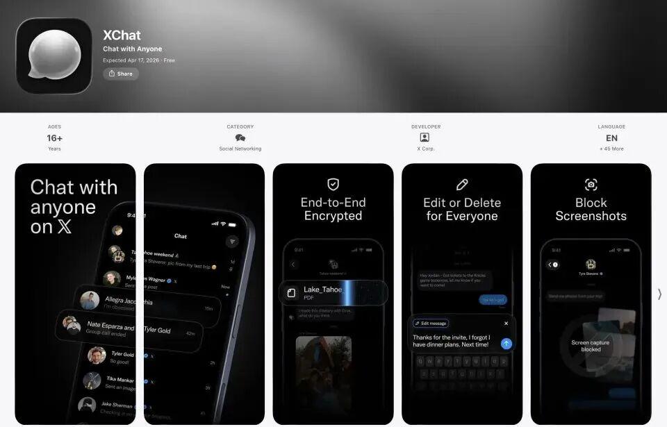 当地时间4月11日,X平台旗下社交应用XChat宣布,将于4月17日正式登陆苹果App Store.