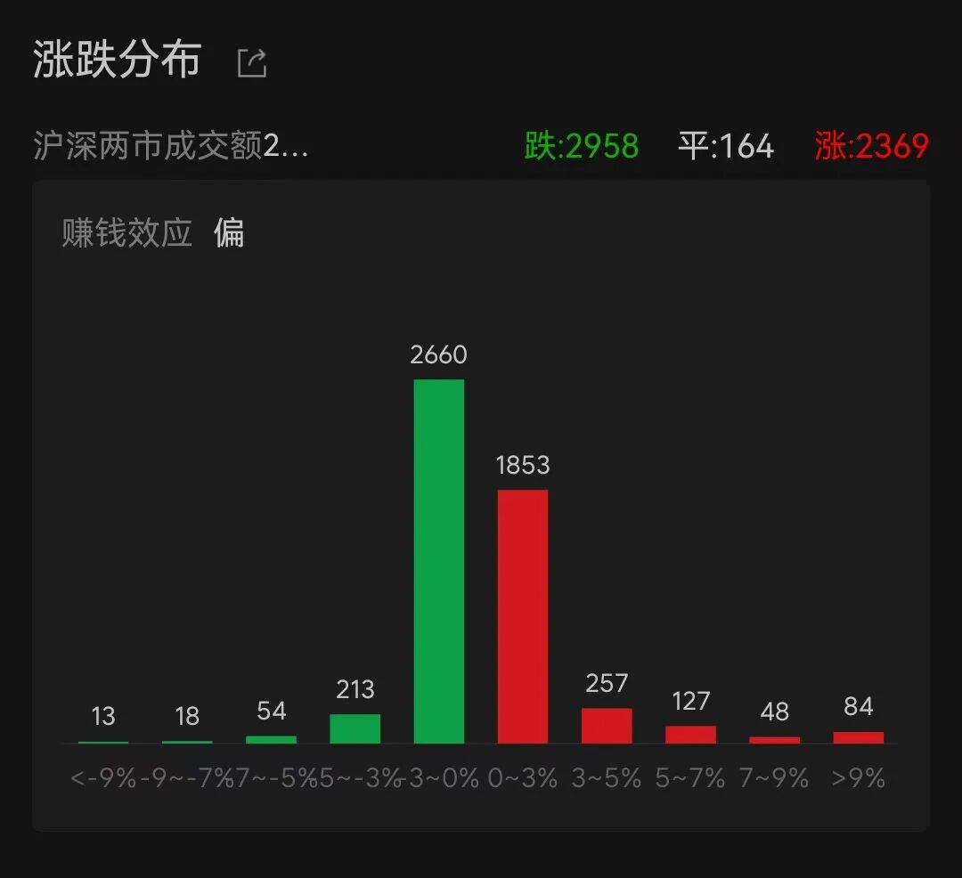 沪深两市成交额2.14万亿,较上一个交易日缩量1725亿。两市近2400只个股上涨,超2900只个股下跌。