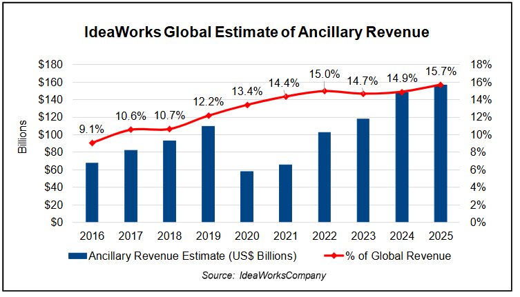 行业整体来看,辅助业务收入对航司也是越来越重要。最新数据显示,2025年全球航空辅助收入预计达1570亿美元,占行业总收入的15.7%。