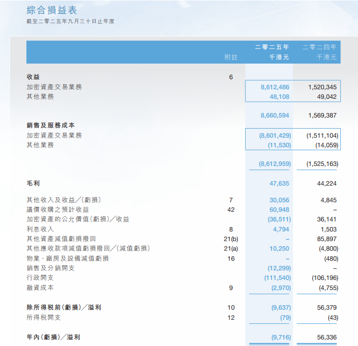 根据新火集团披露的截至2025年9月30日止的年度业绩公告显示,2025年度,该公司实现总收入86.61亿港元,同比增长451.8%。其中,加密资产交易业务收入约86.12亿港元,同比增长466.5%。公司表示,营收增长主要源于加密货币OTC交易业务规模的显著扩大,该业务采取低毛利、放量型策略,旨在快速提升市场影响力。