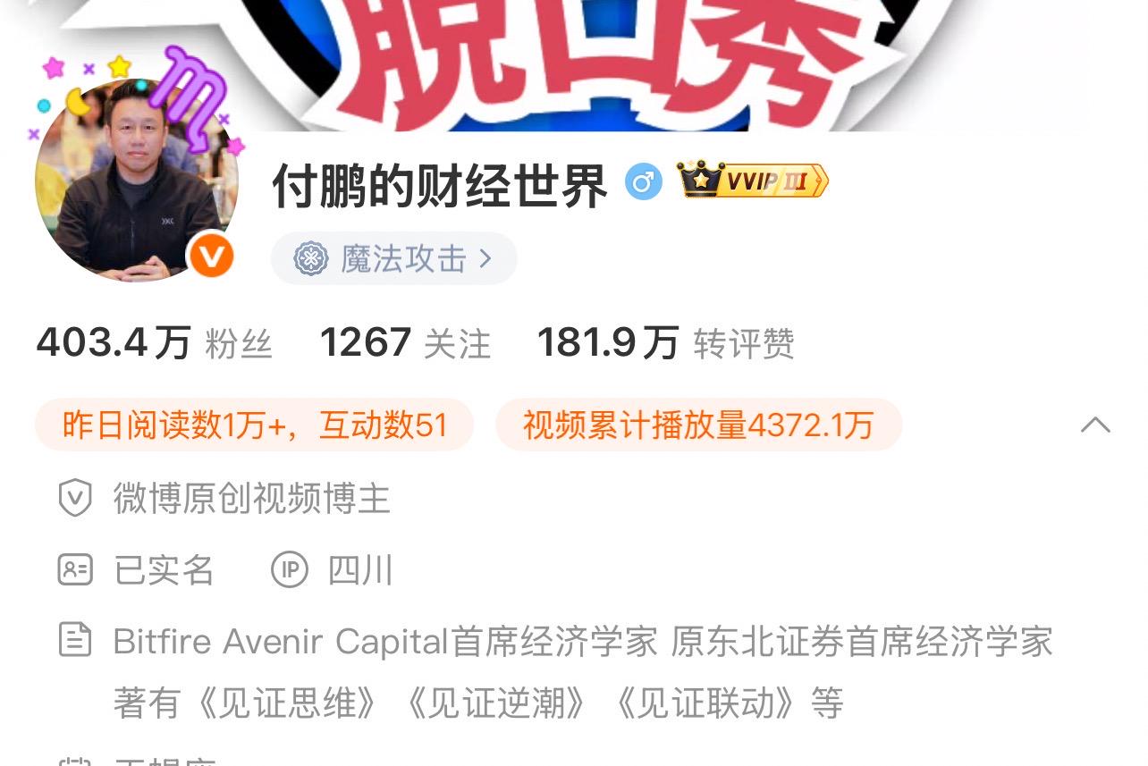 红星资本局注意到,付鹏是知名网红经济学家,其个人社交账号“付鹏的财经世界”在微博、小红书、哔哩哔哩等平台累计拥有数百万粉丝,持续分享经济学观点。