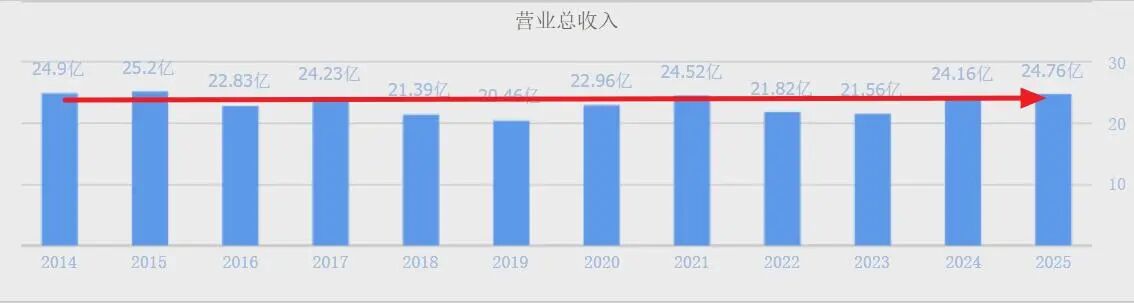 2014年的时候,公司的营收就已经达到了24个亿了,12年之后,公司营收依然还在24亿,可以说几无增长。
