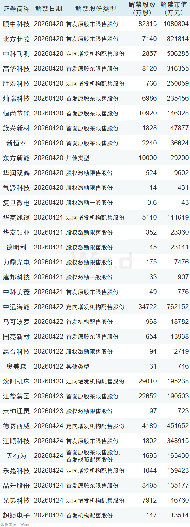 Wind数据统计显示,本周(4月20日-4月24日)共有34家公司限售股陆续解禁,合计解禁24.8亿股,按4月17日收盘价计算,解禁总市值为615.38亿元。
