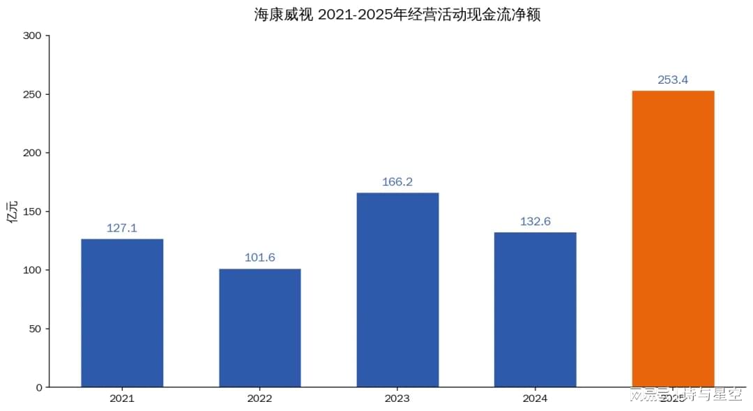 海康威视2025年的现金流数据,绝对是全年报最亮眼的那颗星。经营活动现金流净额253.39亿元,同比暴增91.04%。什么概念?这是海康威视历史上第二高的年度经营现金流。