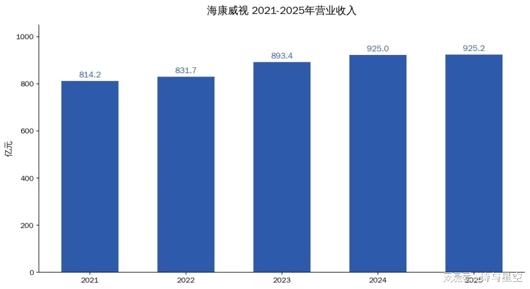 海康威视的营收,已经连续两年踩在925亿元左右了。2023年893.41亿元,2024年924.96亿元,2025年925.18亿元。从增速来看,2023年还有7.42%,2024年就跌到3.53%,2025年几乎零增长。