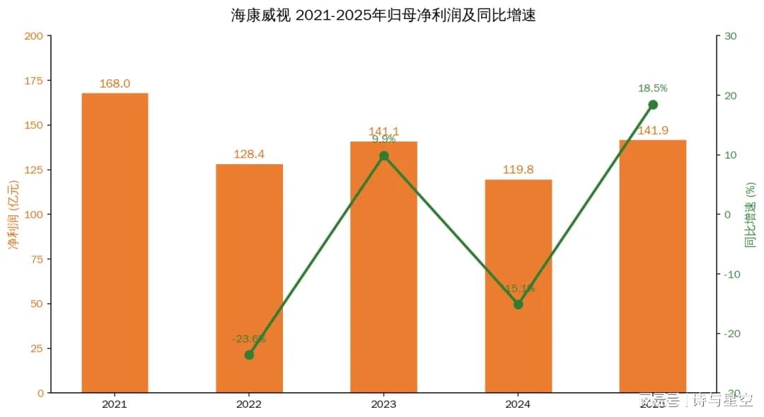 海康威视 2021-2025年归母净利润及同比增速