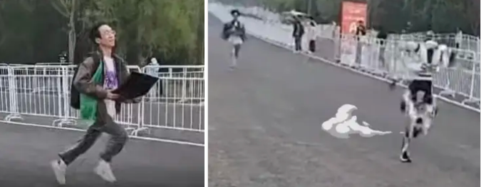 不仅注册好的人类选手在跑,还有网友拍到工程师也跟在“越狱”的机器人身后猛追,手上还捧着一台笔记本电脑。