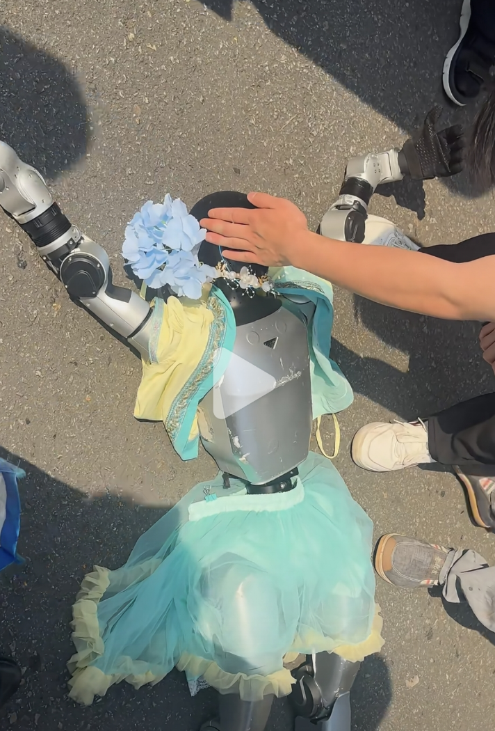 还有梳着俩小辫、拿着奶瓶的宝宝机器人,孩子没断奶就出来营业,结果还没跑出几步就摔了个底朝天,旁边还有看热闹不嫌事儿大的宇树机器人非但不扶一把,还忍不住鼓起掌来。
