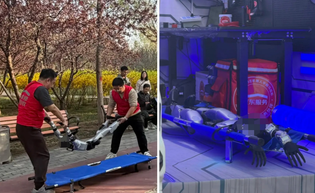 但如果你站在赛道边多看一会儿,会发现赛场上最忙的,不是那些冲线的机器人,也不是追在后面捧着笔记本撒丫子狂奔的工程师,而是「机器人救护车」。红衣工作人员合力把一台台“倒下”的机器人抬上车:没电的、关节卡死的、摔到怀疑人生的,被统一送往终点“抢救”。