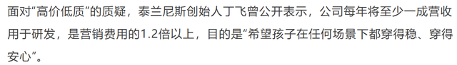 为支撑如此高的溢价,泰兰尼斯在宣传中强调技术投入,创始人丁飞曾公开表示,每年将至少一成营收用于研发,是营销费用的1.2倍以上。