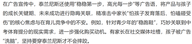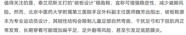 更令人担忧的是,泰兰尼斯主打的“碳板设计”稳跑鞋,宣称可增强稳定性、减少崴脚风险,却遭到医学专家的警告。