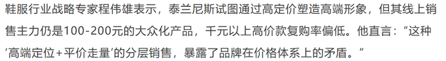 然而,这种高举高打的营销策略也引发了业内质疑。据《新识研究所》报道,鞋服行业战略专家程伟雄指出,泰兰尼斯试图通过高定价塑造高端形象,但其线上销售主力仍是100-200元的大众化产品,千元以上高价款复购率偏低。他直言:“这种‘高端定位+平价走量’的分层销售,暴露了品牌在价格体系上的矛盾。”