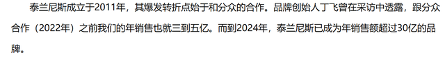 营销投入带来了惊人的回报。据《蓝鲸新闻》报道,创始人丁飞曾透露,跟分众合作之前年销售也就三到五亿,而到2024年,泰兰尼斯已成为年销售额超过30亿的品牌。另据《证券之星》报道,2025年前三季度营收更是飙升至36亿,超越24年全年总和。