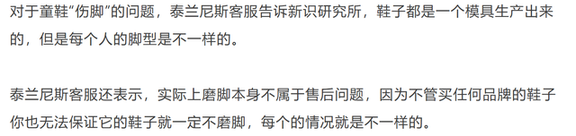 面对消费者的质疑,泰兰尼斯客服的回应更是引发众怒:“鞋子都是一个模具生产出来的,但是每个人的脚型是不一样的”“磨脚本身不属于售后问题,因为不管买任何品牌的鞋子你也无法保证它的鞋子就一定不磨脚”。