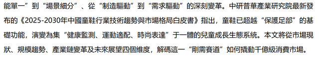 中研普华产业研究院指出,童鞋已超越“保护足部”的基础功能,演变为集“健康监测、运动适配、时尚表达”于一体的儿童成长生态系统。在这个千亿级市场中,家长对儿童足部健康认知的提升,催生了“功能鞋”需求的爆发。