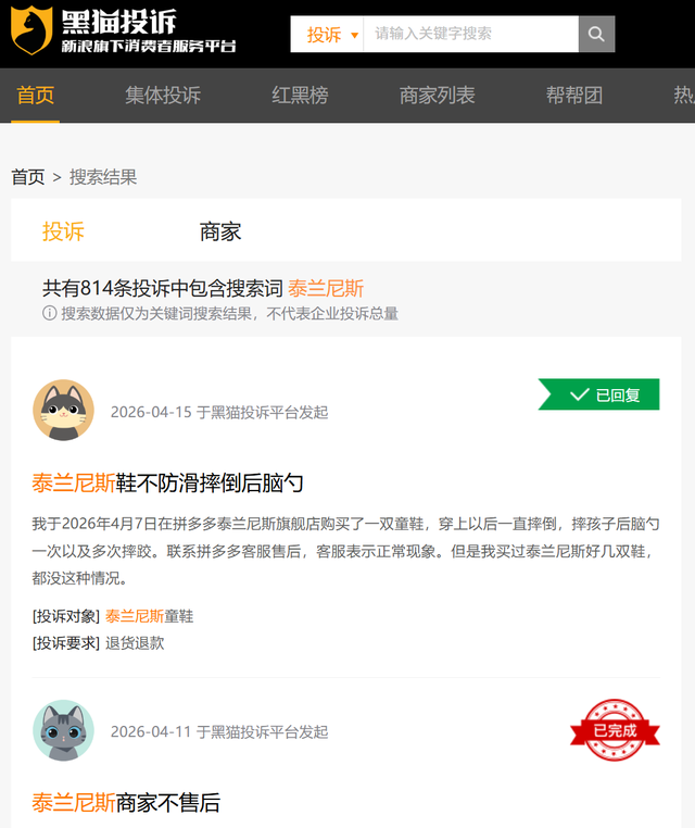 在黑猫投诉平台上,关于泰兰尼斯的投诉已超过800起。用户反映的问题高度集中:新鞋穿1-2次即大面积脱胶、掉漆,换新后问题依旧;鞋子内部硌脚、磨脚,孩子穿着后出现红肿、肿胀。